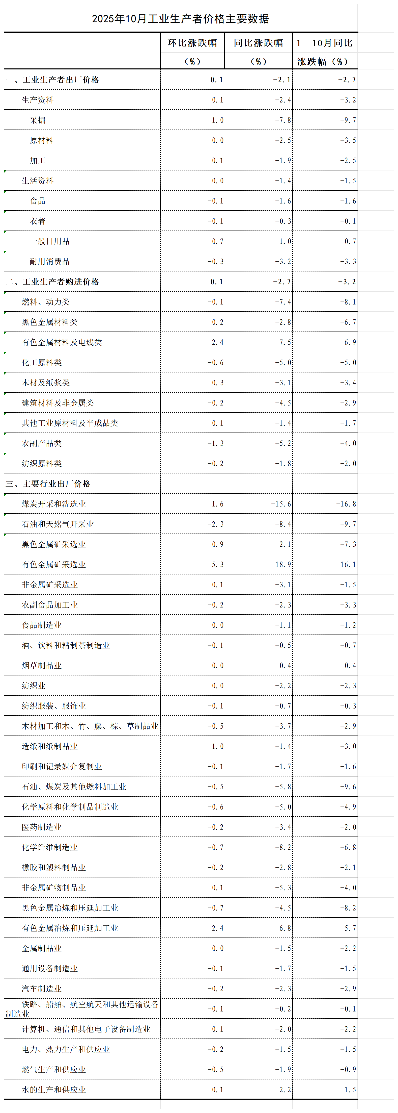 10月份,工业生产者出厂价格中,生产资料价格上涨0.1%,影响工业生产者出厂价格总水平上涨约0.08个百分点。其中,采掘工业价格上涨1.0%,原材料工业价格持平,加工工业价格上涨0.1%。生活资料价格持平。其中,食品、衣着价格均下降0.1%,一般日用品价格上涨0.7%,耐用消费品价格下降0.3%。
